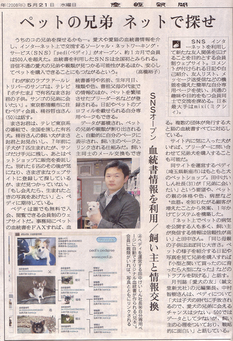 ★ 2008年、兄弟探しサイト『ぺディ』について、産経新聞に掲載されました。★ 記事はコチラ