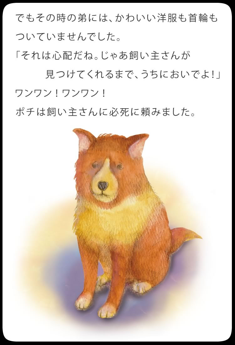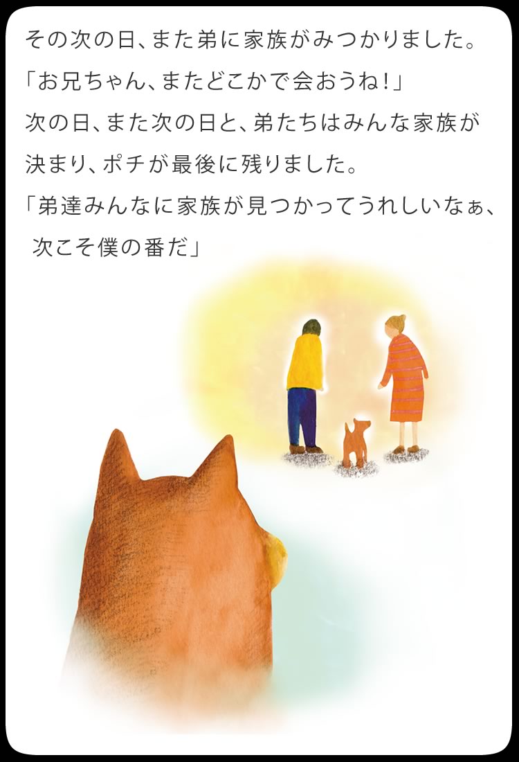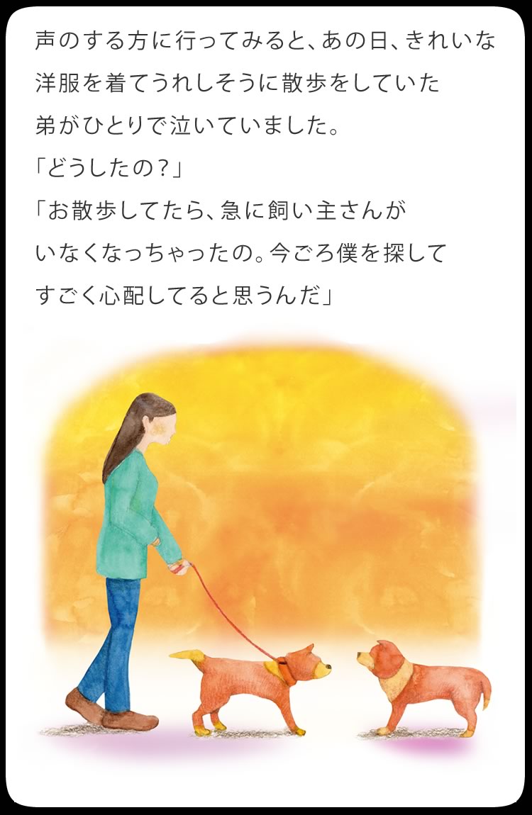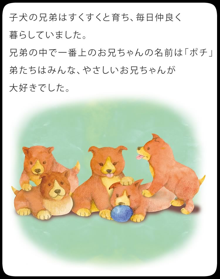 ポチを飼っていた頃に比べると、仔犬のカラーやサイズ、欠点の有無など、ショップが競って付加価値をつける時代になるにつれ、犬を飼う本当の意義が分からないで飼ってしまう人が増えているような気がします。その事は、販売頭数の増加に伴って増えつづけている、保健所に捨てられる犬の数の増加が示しているのかもしれません。欠点のない兄弟が引き取られていくのをみて、仔犬が言っているような気がします。